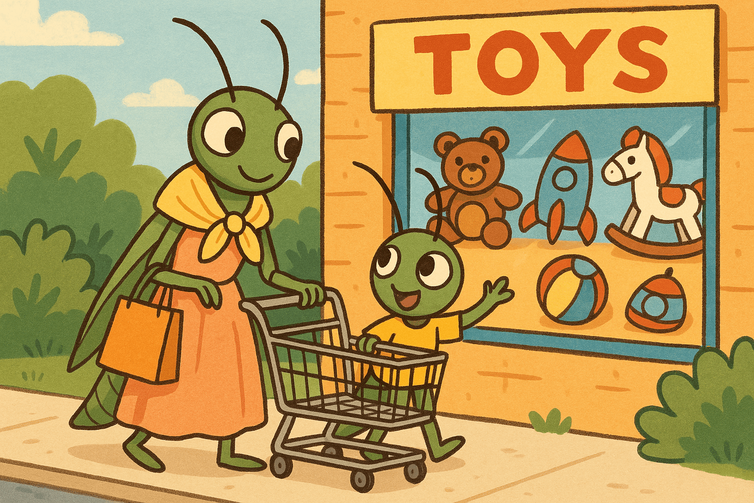 Piața cu mărunțișuri, la două străzi distanță de căsuța sa, avea jucării câte-n lume n-ai văzut. Vai de bieții greierași, fără bani pentru de toate. Multe pofte, multe visuri, erau amânate…